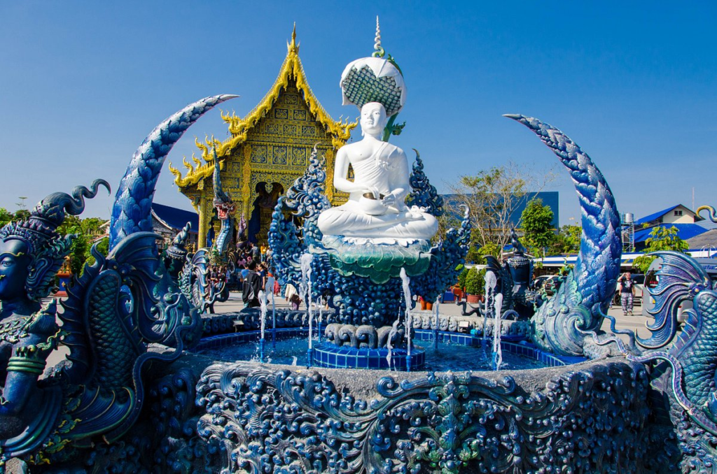 【清萊藍廟】「藍廟」又名舞虎寺(Blue Temple ; Wat Rong Suea Ten ; วัดร่องเสือเต้น),泰文原意為「跳舞的老虎」,始建於1996年。藍廟由清萊白廟設計者的徒弟所設計建造,雖然規模較白廟小,但是整體外觀呈現耀眼宏偉的藍色,內部佛像精緻,是一座傳統與現代藝術完美融合的泰式寺廟。